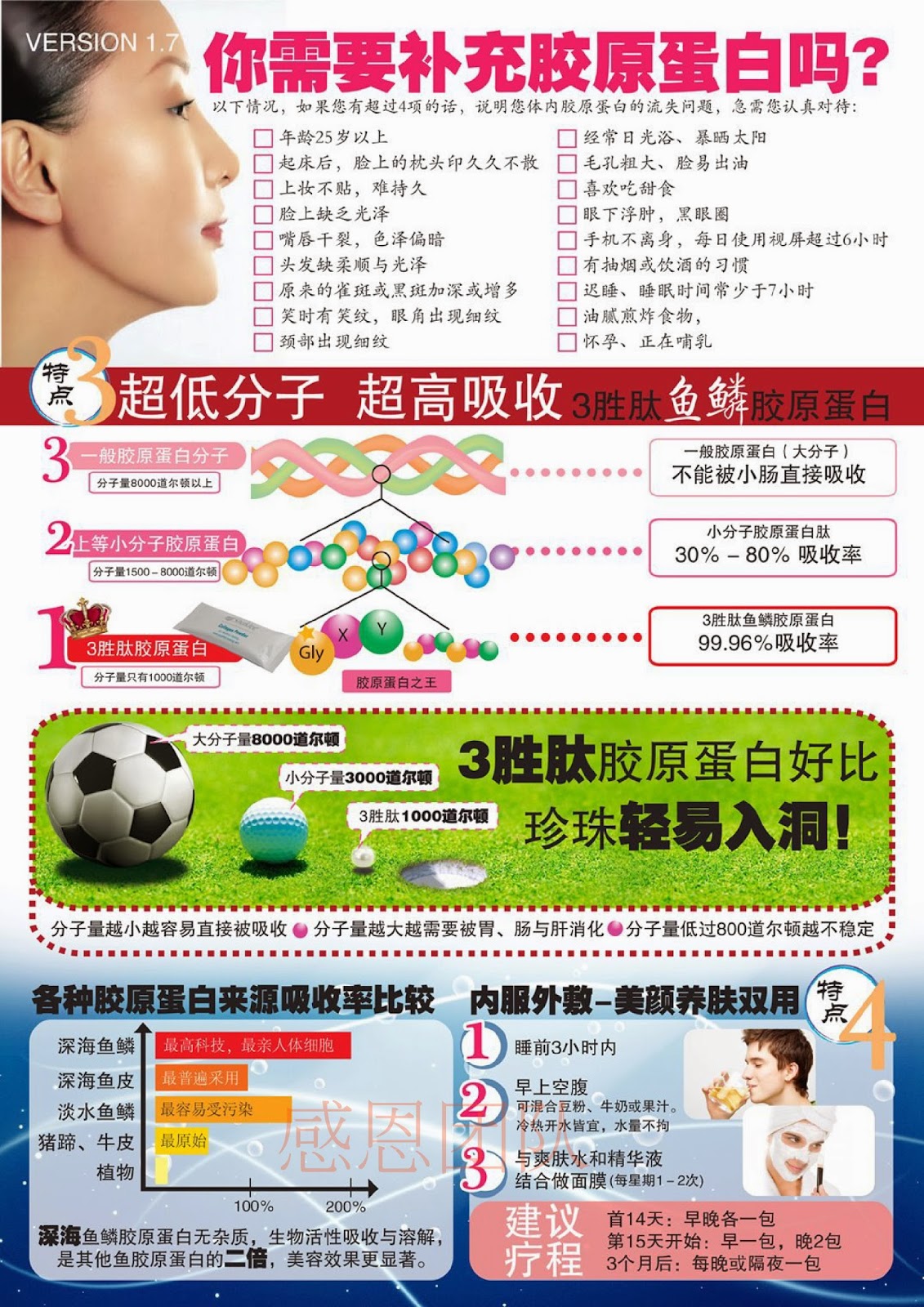 Collagen娇媛蛋白。“胶 原蛋白流失,是导致肌肤衰老的原因”!嘉康利娇 媛蛋白,100%深海红鲷鱼鳞,极致提升肌肤 的“弹、润、白、滑”。产品优势:超小分子,超高 吸收;100%高功效,更快变年轻;零添加,安全 有保障;零脂肪,美丽零负担。另外,胶原蛋白 帮助我们修复与改善骨质密度,预防骨质疏松; 让细胞排列整齐,有助于营养的良好吸引,与细 胞内的毒素代谢。一般用法:每天一至两条。