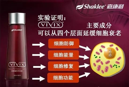 嘉康利VIVIX的主要成分经实验证明,可以从细胞防御、能量、修复及功能等四个层面对抗细胞老化。