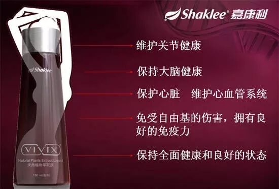 VIVIX可以很好的保护心脏和大脑的健康,维护心血管系统和关节的健康.保护我们的每一个细胞免受自由基的伤害,有了更好的自我修护能力,获得良好的免疫力,保持全面健康和良好的状态。所有处在亚健康状态的朋友,听了这么多也看了这么多,让自己不得病或晚得病的最好方法就是立刻行动喝vivix,