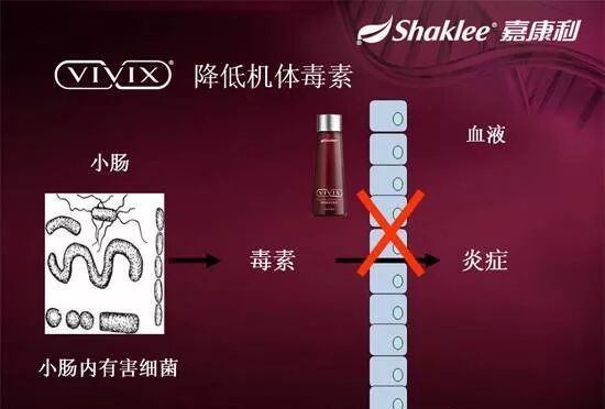 很多人的饮食习惯不健康,使体内产生大量的毒素,这些毒素进入血液,会促使炎症产生,比如胃炎迁延不愈,易导致胃癌;宫颈炎反反复复,易导致宫颈癌;肝炎不好好调理,易转换化成肝癌。VIVIX可以在肠壁直接挡住毒素进入血液,从而抑制炎症的发生。