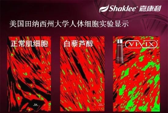 这是一个关于线粒体的临床实验,是在美国线粒体专家杰姆博士实验室进行的研究,图中绿色的部分代表人体肌细胞中的线粒体,第一张图是一个健康的肌细胞中线粒体的数量,第二张图是使用了白黎芦醇后,细胞中的线粒体有所增加。第三张使用VIVIX后,线粒体数量大幅VIVIX增加了由于线粒体的数量和能量的增加,从而加强了新陈代谢,让您拥有了年轻的活力。