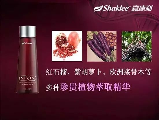 VIVIX中含有法国高级红酒中的萃取物白黎芦醇。红酒具有抗衰防老化的功效,可控制皮肤的老化,以及红酒的美容功能都源于它含有丰富的多酚物质,尤其含有白藜芦醇天然多酚。而VIVIX中的白藜芦醇含量为每5ml中不少于100杯高档红酒中所含的白藜芦醇!VIVIX中含有超过25种的天然植物超级多酚!这些成分具有超强的抗氧化功能,是天然的植物抗生素,被誉为“抗老化圣品”,能提高人体的新陈代谢,淡化色素,使皮肤变得更加白皙和光滑。每天喝一点VIVIX,会让你比不喝的人更年轻更健康!