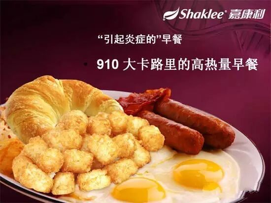 这是一份高热量、高脂肪的早餐,过高的热量和脂肪摄入会导致炎症的产生。我们选择了10个健康的学生,让他们吃了910卡路里的高热量、高脂肪的早餐。