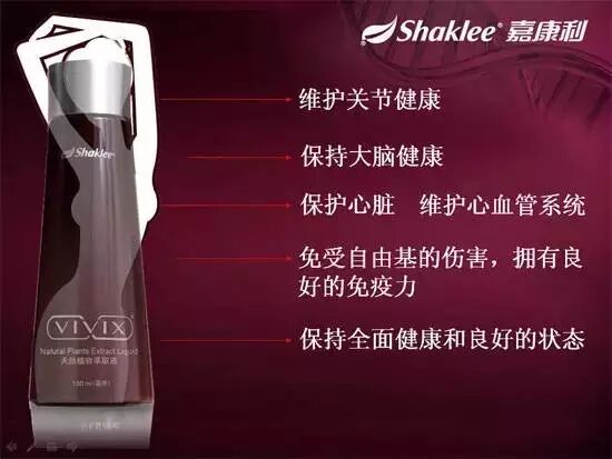 嘉康利VIVIX的主要成分经实验证明,可以从细胞防御、能量、修复及功能等四个层面对抗细胞老化。大家都知道现在市面上抗衰老的产品非常的火爆,任何一家公司做抗衰老产品都有一个共同的梦想就是要占领更多的市场,嘉康利公司是全球唯一一家能够从以上四个层面同时入手帮助我们去缓解亚健康达到延缓衰老的目的,但市面上大部分公司只能从其中的某一方面入手,那我们说谁的市场更大?