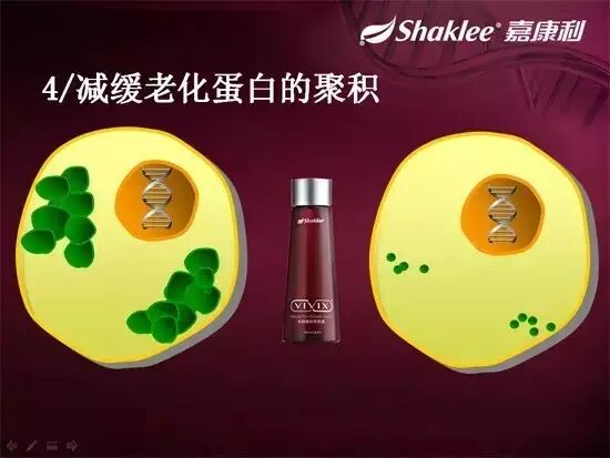 细胞中的绿色部分是糖基化终产物,也叫AGE老化蛋白。AGE老化蛋白堆积在人体是一种垃圾,会影响细胞功能的正常运作。当老化蛋白堆积在眼睛细胞,容易有白内障等退行性疾病产生;当它堆积在胰腺细胞,容易影响血糖异常分泌,严重会导致糖尿病产生;当它堆积在大脑细胞,会影响思维,容易变成老年痴呆症。由此可见细胞里面垃圾物质的的过多堆积就会造成更多的慢性疾病;VIVIX能够有效清除老化蛋白,缓解老化蛋白堆积的进程,从而减缓细胞的老化。让我们拥有青春活力。