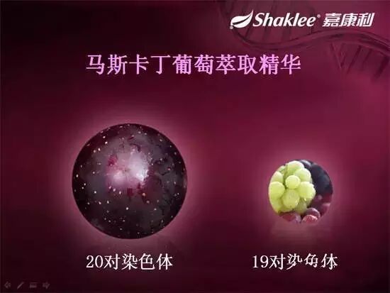VIVIX中最关键的成分是马新卡丁超级葡萄萃取的葡萄多酚。马斯卡丁葡萄的生长在高温潮温、日照充足,气候炎热的美国东南部。特殊的环境缔造了它顽强的生命力,个头像中国的李子一样大;皮也很厚,籽很丰满,它是目前世界上唯一拥有20对染色体的超级葡萄。比普通葡萄多了一对染色体,决定了它有更强的生命遗传基因,更好的抗病性和抗虫性。