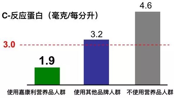 C-反应蛋白,反映人体炎症的指标。这个指标高,这个人得心脑血管病和癌症的概率就高。试验证实:使用嘉康利营养品人群效果最好。