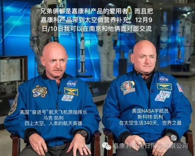 这兄弟俩都是嘉康利产品的爱用者,他们亲口说是嘉康利的产品让他们在太空有更好的身体和工作状态。斯科特·凯利在太空生活了340天,创造了人类之最。他说:在太空每天受到的宇宙射线的辐射相当于每天做10次X光检查,而能让他保持上佳的身体状态,归功于嘉康利的产品。